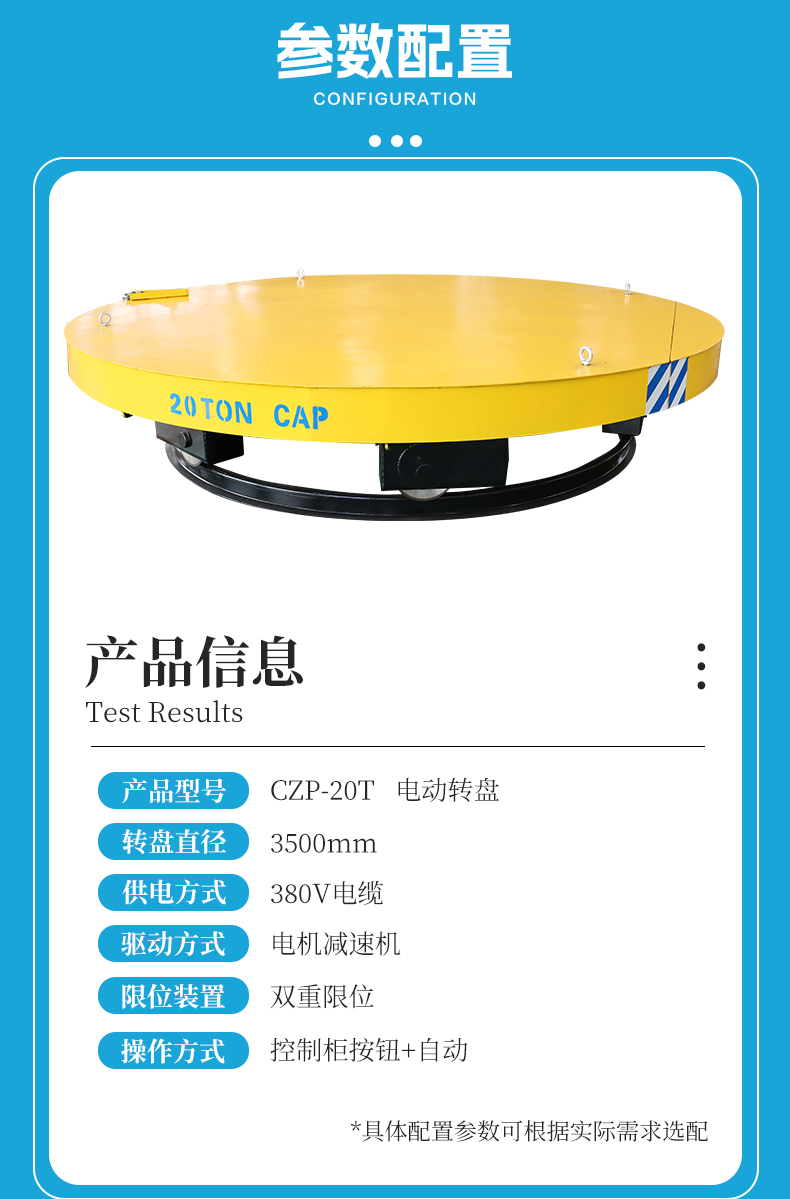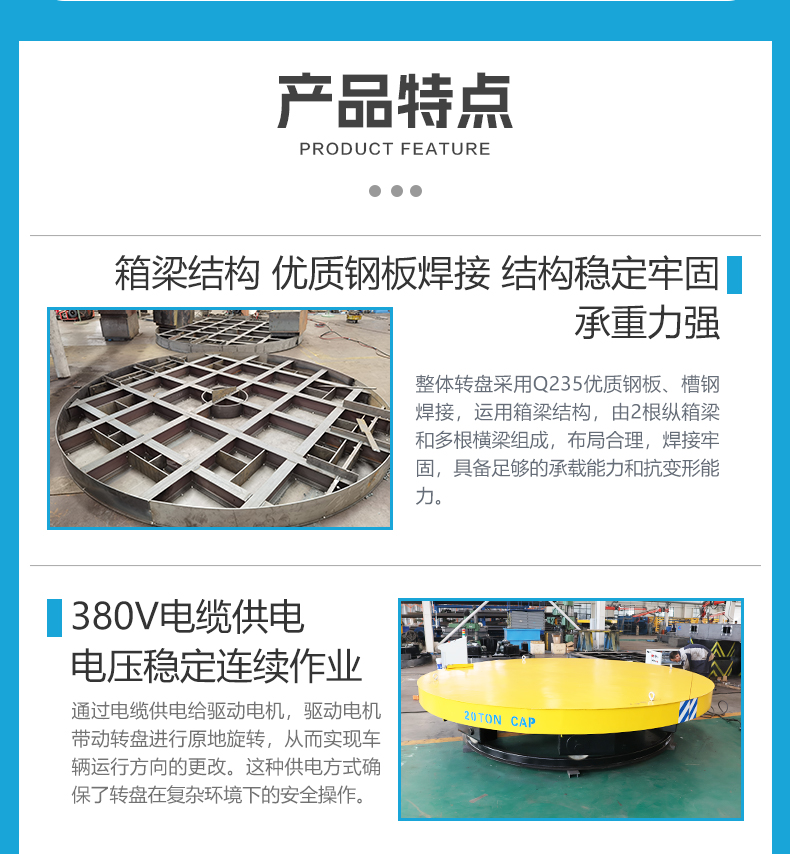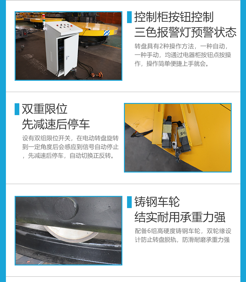 描   述: 客戶訂購的8臺電動轉(zhuǎn)盤***批4臺交付前運行測試,直徑3.5米超大平臺整車箱梁式車架結(jié)構(gòu),高強度鋼板精密焊接成型,可達20噸額定載荷,錐形箱支撐穩(wěn)定牢固。轉(zhuǎn)盤具有手動操作與自動控制兩種模式,雙重限位開關(guān)設(shè)置兩點位自動停靠,180°雙向旋轉(zhuǎn),,定位精度正負3mm,雙工位一鍵切換響應(yīng)快精度高停靠平穩(wěn),外接380V動力系統(tǒng),支持24小時連續(xù)高強度作業(yè)!