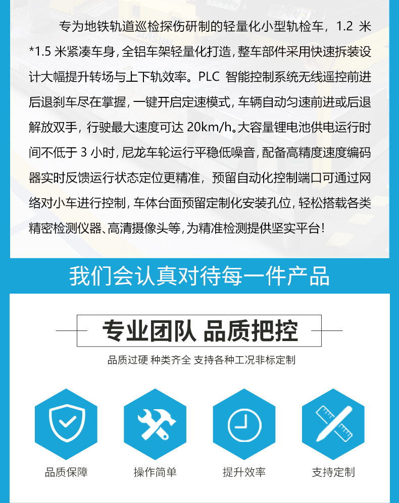 描   述: 鋁合金地鐵軌道巡檢車,用于搭載檢測設(shè)備對地鐵軌道進(jìn)行探傷檢測作業(yè)的移動(dòng)平臺,整車模塊化設(shè)計(jì)可快速拆裝,方便上下軌搬運(yùn),小車長1.2米寬1.5米額定載荷0.5噸,臺面預(yù)留安裝孔位方便檢測儀器、探傷裝置、高清攝像頭組等設(shè)備安裝,PLC智能控制系統(tǒng)無線遙控前進(jìn)后退剎車盡在掌握,一鍵開啟定速模式,車輛自動(dòng)勻速前進(jìn)或后退解放雙手。