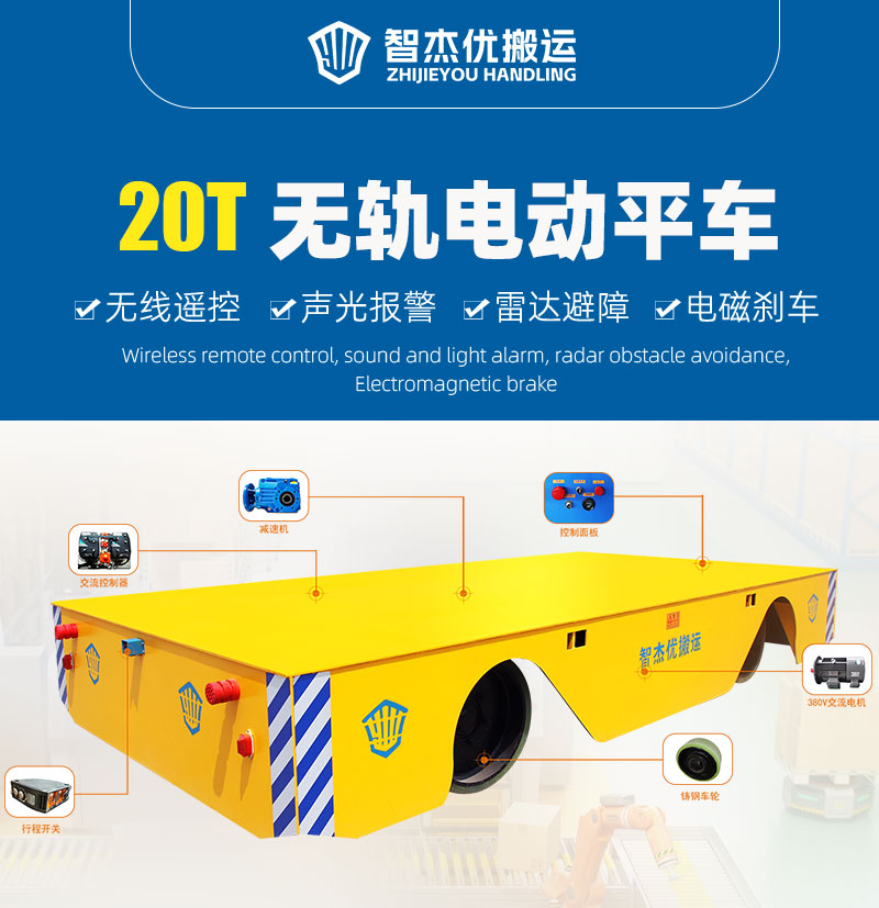 該無(wú)軌電動(dòng)平車可輕松搬運(yùn)20噸的貨物,平臺(tái)鋼板耐摔耐砸抗沖擊能力強(qiáng),車身裝有聲光報(bào)警光電檢測(cè)遇到障礙自動(dòng)停車,結(jié)合現(xiàn)代化電氣工程,可實(shí)現(xiàn)無(wú)人駕駛、遠(yuǎn)程微機(jī)控制等多種操控方式,智杰優(yōu)制造電動(dòng)平車多年,產(chǎn)品經(jīng)驗(yàn)豐富,期待您的合作。