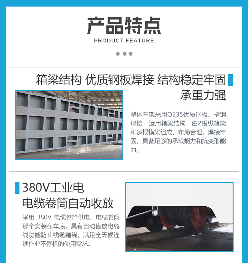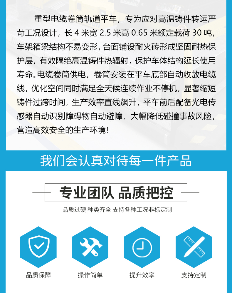 描   述: 重型電纜卷筒軌道平車,專為應(yīng)對高溫鑄件轉(zhuǎn)運嚴苛工況設(shè)計,長4米寬2.5米高0.65米額定載荷30噸,車架箱梁結(jié)構(gòu)不易變形,臺面鋪設(shè)耐火磚形成堅固耐熱保護層,有效隔絕高溫鑄件熱輻射,保護車體結(jié)構(gòu)延長使用壽命。電纜卷筒供電,卷筒安裝在平車底部自動收放電纜線,優(yōu)化空間同時滿足全天候連續(xù)作業(yè)不停機,顯著縮短鑄件過跨時間,生產(chǎn)效率直線飆升,平車前后配備光電傳感器自動識別障礙物自動避障,大幅降低碰撞事故風(fēng)險!