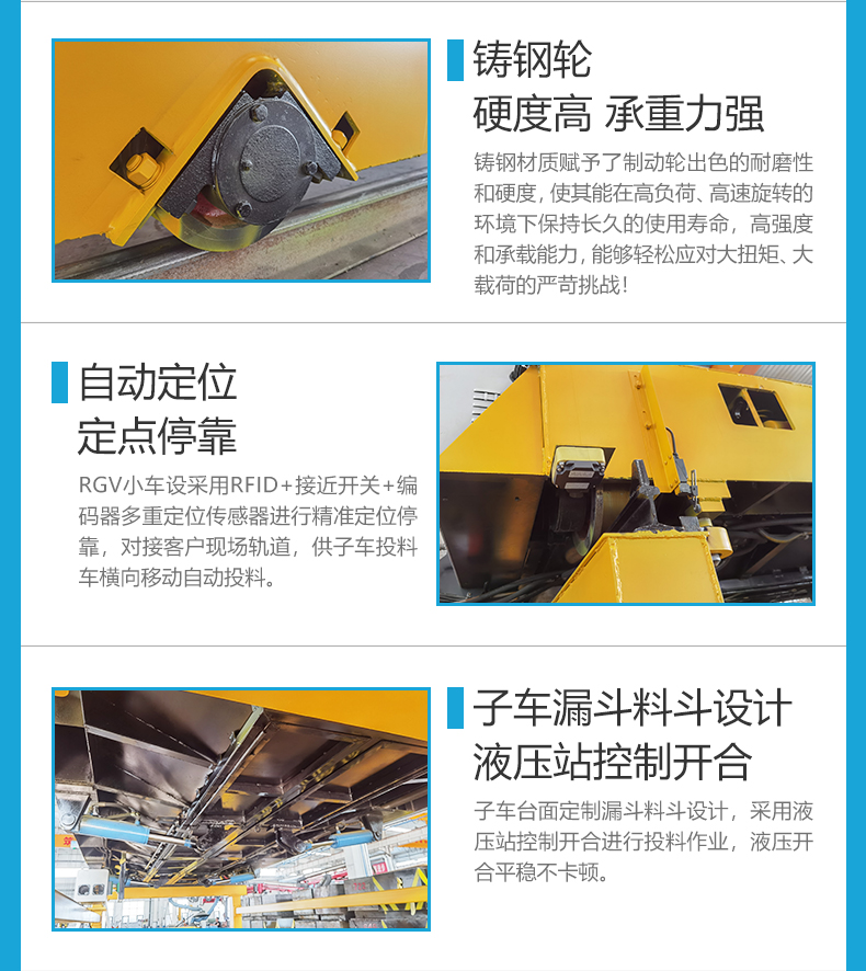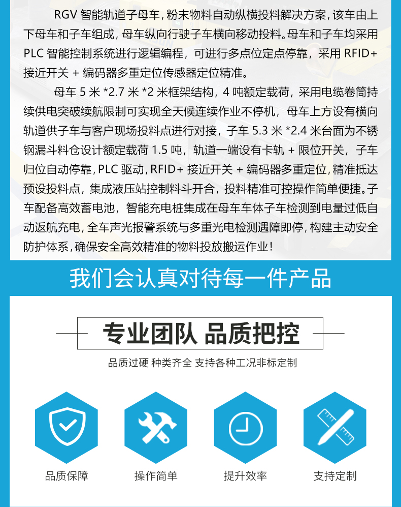 描   述: RGV智能軌道子母車,粉末物料自動縱橫投料解決方案,該車由上下母車和子車組成,母車縱向行駛子車橫向移動投料。母車和子車均采用PLC智能控制系統(tǒng)進(jìn)行邏輯編程,可進(jìn)行多點位定點???,采用RFID+接近開關(guān)+編碼器多重定位傳感器定位***,集成液壓站控制料斗開合,投料***可控操作簡單便捷。
