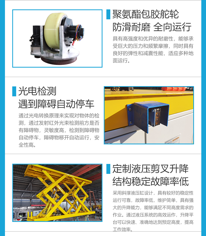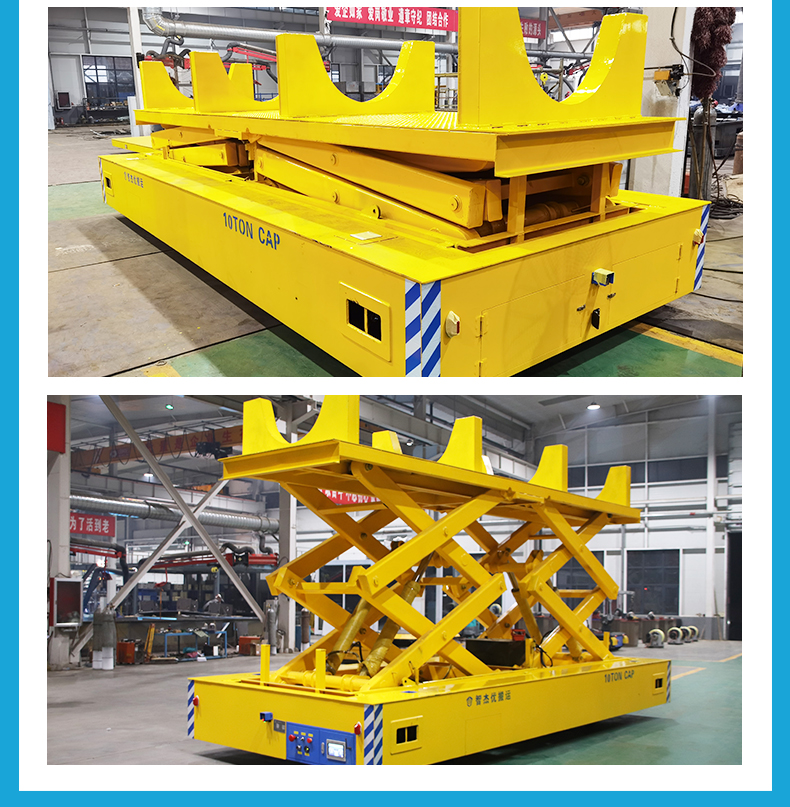 熱線:15517329551 智杰優(yōu)搬運為鐵路隧道施工定制的10噸升降全向無軌搬運車,整車長6米寬2.4米高1.3米額定載重10噸。臺面加裝大型液壓剪叉升降裝置定制動力單元升降行程2.4米,無線遙控操作上下升降簡單靈活,輪系配備舵輪搭配萬向輪可全向移動,舵輪轉(zhuǎn)向穩(wěn)定靈活控制***,可實現(xiàn)縱橫移動、原地旋轉(zhuǎn)、米字斜行等運動控制,狹窄工況環(huán)境下可***停靠完成頂升搬運作業(yè),升降平臺上方定制4個U型置物架,極限頂升狀態(tài)下也能確保物料安全!