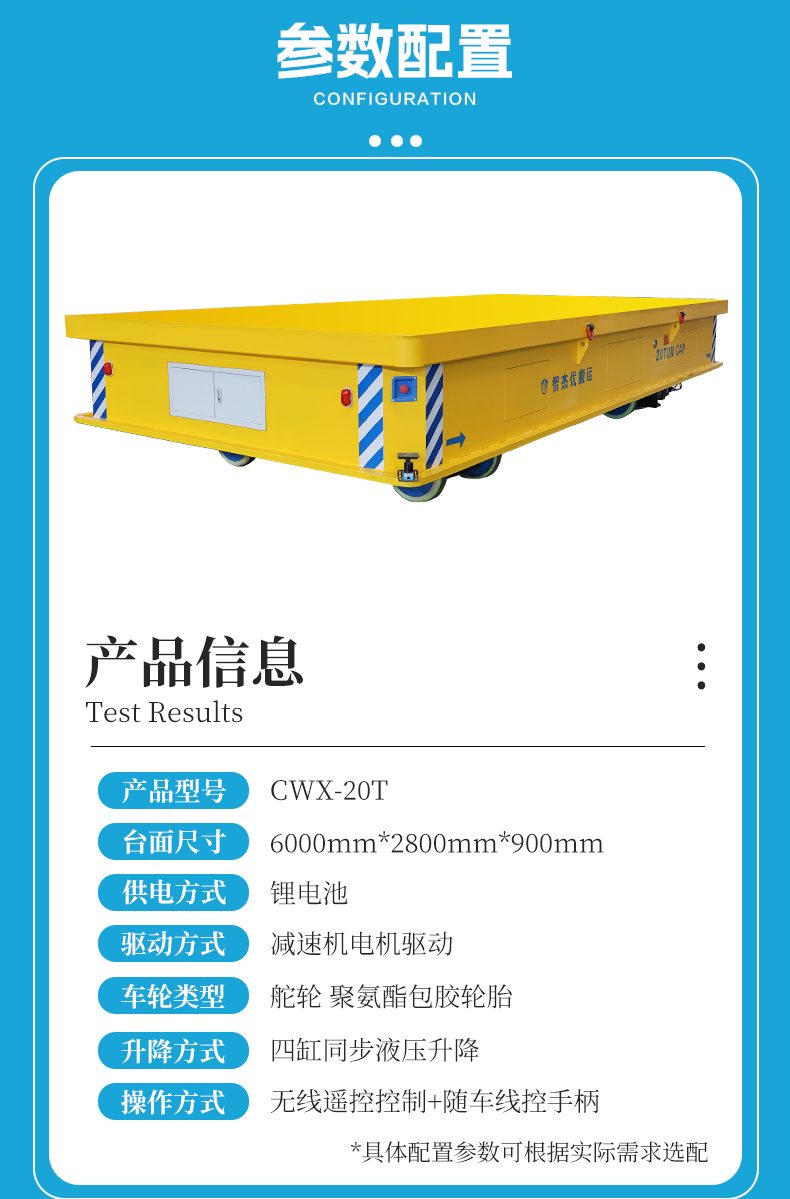 描   述: 重載20噸的縱橫移動(dòng)升降無軌電動(dòng)平車。定制化四缸同步升降平臺(tái),載重高度自由調(diào)節(jié)輕松適配托架進(jìn)行大型設(shè)備轉(zhuǎn)運(yùn)。伺服電機(jī)伺服行星減速機(jī)黃金組合,動(dòng)力澎湃響應(yīng)快***控制毫米級(jí)位移,復(fù)雜路徑也能絲滑運(yùn)行。內(nèi)置高精度稱重傳感器,實(shí)時(shí)顯示載重?cái)?shù)據(jù),超載自動(dòng)預(yù)警杜絕安全隱患。輪系配備四組差速舵輪系統(tǒng),360°全向移動(dòng),狹窄空間內(nèi)也能進(jìn)退自如、直角轉(zhuǎn)彎、橫向平移、原地旋轉(zhuǎn)行云流水,全向移動(dòng)減少無效路徑提高搬運(yùn)效率