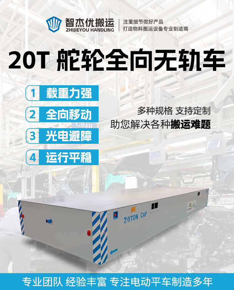 描   述: 20噸全向移動無軌平板車,7米*2.4米寬大平臺0.9米定制高度,高強鋼焊接穩(wěn)定牢固輕松承載重型設(shè)備、大型模具,輪系配備2個高性能聚氨酯包膠舵輪+2個萬向輪組合,配合精密伺服電機減速機驅(qū)動動力澎湃輸出穩(wěn)定,集前進后退、左右轉(zhuǎn)彎、縱橫移動、米字斜行、原地旋轉(zhuǎn)于一身,聚氨酯材質(zhì)耐磨靜音不傷地面。無線搖桿+有線手柄兩種操作模式簡單方便上手快,光電檢測系統(tǒng)實時掃描障礙物,遇障自動停車確保貨物人員安全。
