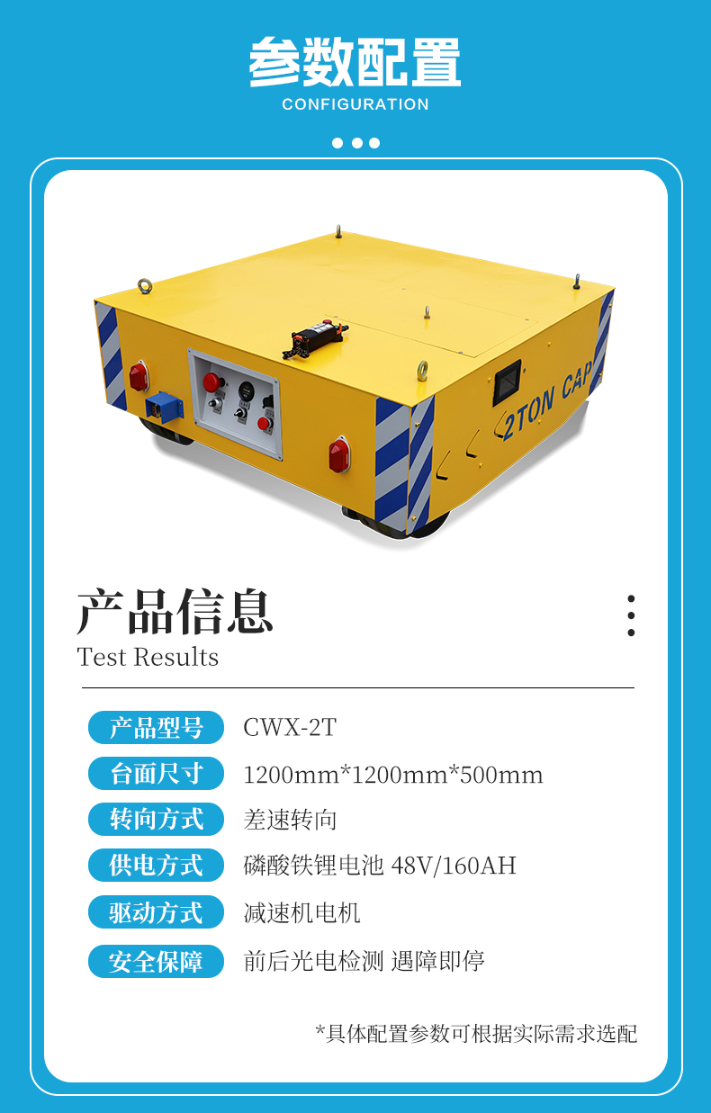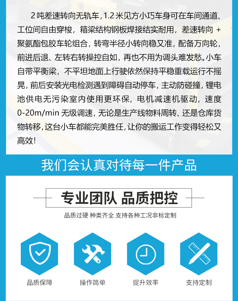 描   述: 2噸差速轉(zhuǎn)向無軌車,1.2米見方小巧車身可在車間通道、工位間自由穿梭,差速轉(zhuǎn)向+聚氨酯包膠車輪組合,轉(zhuǎn)彎半徑小轉(zhuǎn)向穩(wěn)又準,配備萬向輪左轉(zhuǎn)右轉(zhuǎn)操控自如,再也不用為調(diào)頭難發(fā)愁。無論是生產(chǎn)線物料周轉(zhuǎn)、還是倉庫貨物轉(zhuǎn)移,這臺小車都能***勝任,讓你的搬運工作變得輕松又高效!