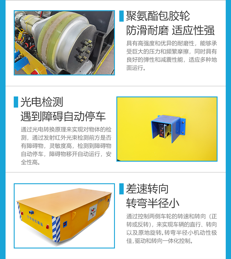 描   述: 長3米寬1.5米高0.8米額定載荷3噸,專為高效、靈活室內(nèi)物料轉(zhuǎn)運(yùn)設(shè)計(jì),堅(jiān)固箱梁車架結(jié)實(shí)能扛,差速轉(zhuǎn)向原地掉頭,零轉(zhuǎn)彎半徑狹窄空間也不怕,前進(jìn)、后退、左右轉(zhuǎn)彎,聚氨酯包膠輪室內(nèi)室外都能跑,蓄電池驅(qū)動(dòng)安靜無污染適用于潔凈車間與室內(nèi)環(huán)境,配備光電檢測、聲光報(bào)警、緊急制動(dòng)全方位守護(hù)人與貨,助力車間物料高效安全柔性化轉(zhuǎn)運(yùn)!
