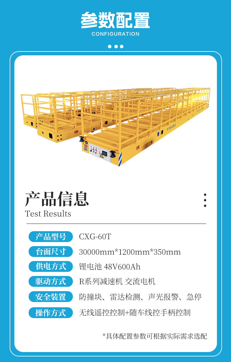 描   述: 為重型門架量身打造,整車長30米,采用三段模塊化設(shè)計,可無縫連接形成一個穩(wěn)固的運輸平臺,額定載荷60噸,三段車體通過高強(qiáng)度專用連接件快速組合,靈活適應(yīng)現(xiàn)場軌道布局,臺面分格設(shè)計,單個格間工位稱重1.5噸,搭載高性能鋰電池供電系統(tǒng),一次充電滿足長時間轉(zhuǎn)運需求!