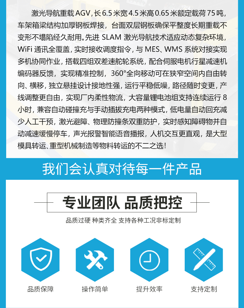 描   述: 75噸級(jí)重載AGV,卓越性能、強(qiáng)大承載,差速舵輪精密驅(qū)動(dòng),360°全向移動(dòng),***slam激光導(dǎo)航等諸多功能加持,WiFi通訊、雙重防護(hù)體系,助力車間物料實(shí)現(xiàn)柔性化轉(zhuǎn)運(yùn)!