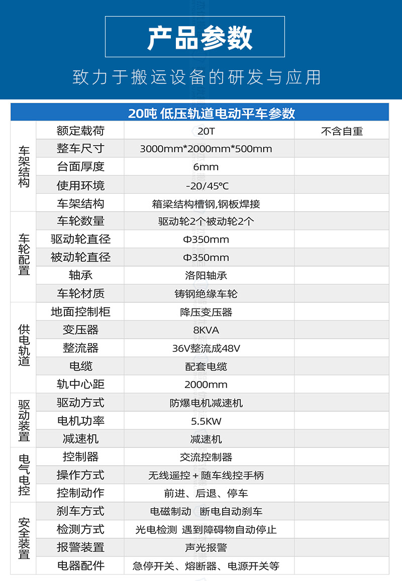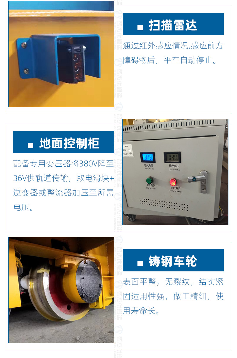 描   述: 尺寸長3米寬2米高度0.5米,可轉(zhuǎn)運(yùn)20噸的貨物,配有獨(dú)立的變壓器電柜,可將380伏交流電經(jīng)變壓成安全電壓36伏,通過電纜連接軌道給平車提供電能,結(jié)合現(xiàn)代化電氣工程,實(shí)現(xiàn)無線遙控平車搬運(yùn)作業(yè).