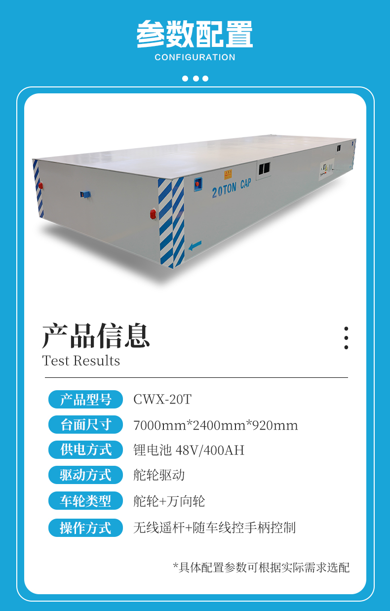 描   述: 20噸全向移動無軌平板車,7米*2.4米寬大平臺0.9米定制高度,高強鋼焊接穩(wěn)定牢固輕松承載重型設(shè)備、大型模具,輪系配備2個高性能聚氨酯包膠舵輪+2個萬向輪組合,配合精密伺服電機減速機驅(qū)動動力澎湃輸出穩(wěn)定,集前進后退、左右轉(zhuǎn)彎、縱橫移動、米字斜行、原地旋轉(zhuǎn)于一身,聚氨酯材質(zhì)耐磨靜音不傷地面。無線搖桿+有線手柄兩種操作模式簡單方便上手快,光電檢測系統(tǒng)實時掃描障礙物,遇障自動停車確保貨物人員安全。