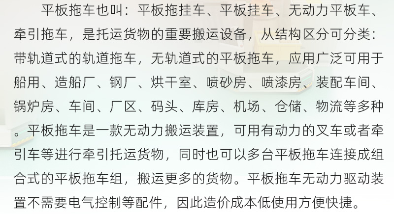 公司保障:電動平車、軌道平車的承重安全系數(shù)不低于60%