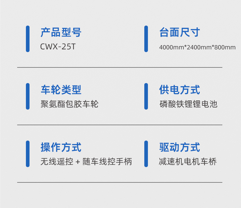 描   述: 無軌電動平板車模具轉(zhuǎn)運(yùn)車出廠前運(yùn)行測試實拍,長4米寬2.4米高0.8米額定載重25噸,客戶主要用于模具的跨車間轉(zhuǎn)運(yùn)作業(yè),鋰電池供電續(xù)航里程長充電時間短,無線遙控操作前進(jìn)后退左轉(zhuǎn)右轉(zhuǎn),液壓轉(zhuǎn)向靈活輕便容易維護(hù),采用電機(jī)車橋驅(qū)動,性能穩(wěn)定可靠,高扭矩輸出傳動效率高驅(qū)動力足,車橋驅(qū)動系統(tǒng)通過性好,負(fù)載力強(qiáng),即使在摩擦力較大的路面也能安全運(yùn)行,室外運(yùn)行具備一定爬坡能力,聚氨酯包膠車輪防滑耐磨彈性好適用性強(qiáng)