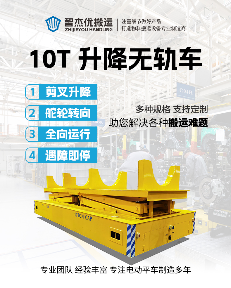 熱線:15517329551 智杰優(yōu)搬運為鐵路隧道施工定制的10噸升降全向無軌搬運車,整車長6米寬2.4米高1.3米額定載重10噸。臺面加裝大型液壓剪叉升降裝置定制動力單元升降行程2.4米,無線遙控操作上下升降簡單靈活,輪系配備舵輪搭配萬向輪可全向移動,舵輪轉(zhuǎn)向穩(wěn)定靈活控制***,可實現(xiàn)縱橫移動、原地旋轉(zhuǎn)、米字斜行等運動控制,狹窄工況環(huán)境下可***停靠完成頂升搬運作業(yè),升降平臺上方定制4個U型置物架,極限頂升狀態(tài)下也能確保物料安全!