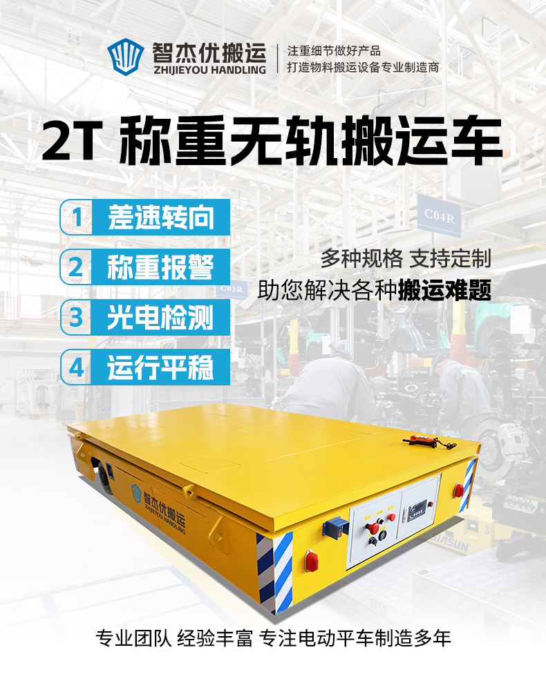 描   述: 智杰優(yōu)搬運(yùn)研發(fā)生產(chǎn)的稱重?zé)o軌搬運(yùn)車,整車長(zhǎng)3米寬1.7米高0.5米額定載重2噸。主要應(yīng)用于粉末新材料噸包袋的稱重運(yùn)輸作業(yè)。車體設(shè)有稱重傳感器,具有稱重、超載報(bào)警提示功能,超過額定載重報(bào)警燈閃爍提示并禁止啟動(dòng)平車,蓄電池供電,空滿載交替運(yùn)行不低于4小時(shí),無線遙控控制平車前進(jìn)后退、左右轉(zhuǎn)彎、加減速,差速轉(zhuǎn)向操控靈活,輪系配備加厚聚氨酯包膠車輪,防滑耐磨壽命長(zhǎng)適應(yīng)性強(qiáng)。