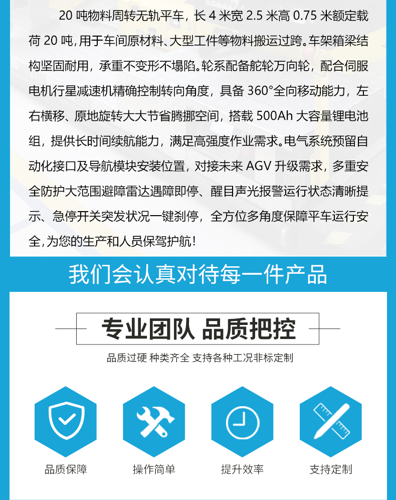 描   述: 機(jī)械加工、重型裝備,大型制造車(chē)間重型原材料、半成品、成品區(qū)的跨區(qū)域、跨工位轉(zhuǎn)運(yùn),離不開(kāi)這臺(tái)20噸全向無(wú)軌電動(dòng)平車(chē)。4米*2.5米大平臺(tái)0.75米定制高度,舵輪萬(wàn)向輪360度移動(dòng)能力、500Ah大容量鋰電池續(xù)航,多重安全裝置報(bào)價(jià)護(hù)航,助力車(chē)間物料柔性化轉(zhuǎn)運(yùn)!