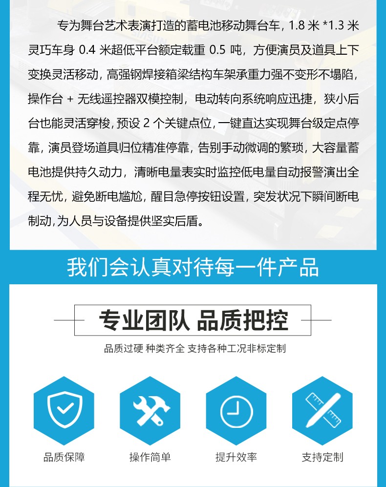 描   述: 這款專為舞臺藝術(shù)打造的蓄電池移動(dòng)舞臺車,以1.8米*1.3米精巧車身0.4米超低平臺額定載重0.5噸,成為您幕后***調(diào)度的秘密武器!預(yù)設(shè)兩個(gè)關(guān)鍵點(diǎn)位,一鍵直達(dá)自動(dòng)???,演員緩緩登場,賦予演出靈動(dòng)生命力,適用于劇院、演唱會(huì)、電視臺演播廳、大型文藝晚會(huì)等各類需要***、安靜、可靠移動(dòng)解決方案的場景。