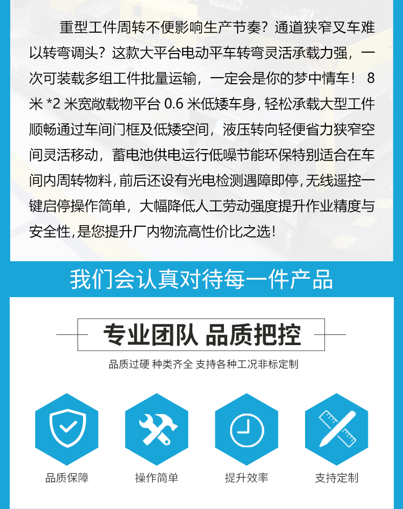 描   述: 重型工件周轉(zhuǎn)不便影響生產(chǎn)節(jié)奏?通道狹窄叉車難以轉(zhuǎn)彎調(diào)頭?這款大平臺電動平車轉(zhuǎn)彎靈活承載力強,一次可裝載多組工件批量運輸,一定會是你的夢中情車!