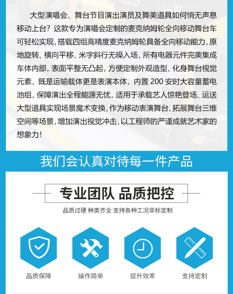 描   述: 大型演唱會(huì)、舞臺(tái)節(jié)目演出演員及舞美道具如何悄無(wú)聲息移動(dòng)上臺(tái)?這款專(zhuān)為某明星演唱會(huì)定制的麥克納姆輪全向移動(dòng)舞臺(tái)車(chē)輕松實(shí)現(xiàn)。高精度麥克納姆輪具備全向移動(dòng)能力無(wú)噪入場(chǎng),定制外觀造型、化身舞臺(tái)視覺(jué)元素,即是運(yùn)輸載體更是表演本體,用于承載藝人驚艷登場(chǎng)、運(yùn)送大型道具實(shí)現(xiàn)場(chǎng)景魔術(shù)變換,作為移動(dòng)表演舞臺(tái)、拓展舞臺(tái)三維空間等場(chǎng)景!
