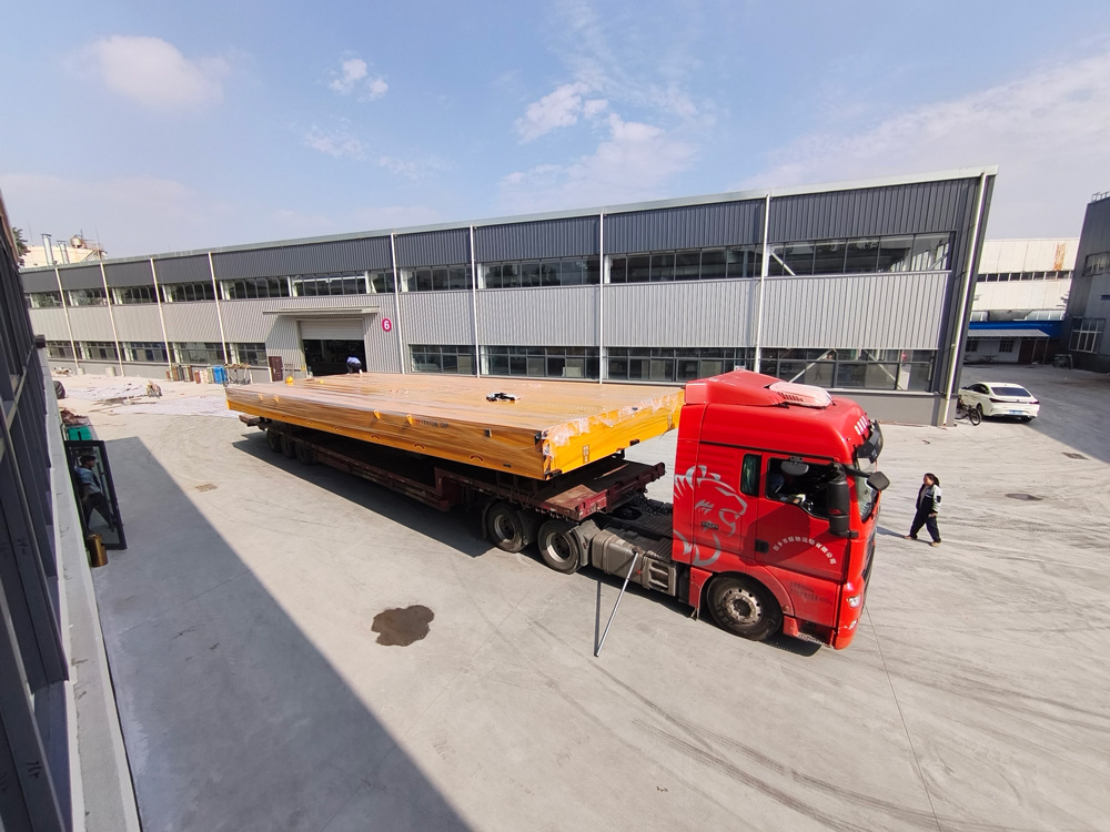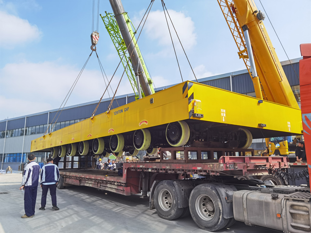 近日,天津客戶定制的120噸大型重載無軌電動平車正式交付發(fā)往客戶現(xiàn)場。此次交付的無軌轉(zhuǎn)運車體量驚人,長達(dá)15米寬達(dá)5米,其核心結(jié)構(gòu)采用高強度整體車架與精密鋼板焊接技術(shù),確保在承受120噸極限載荷時,車體依然穩(wěn)定牢固。