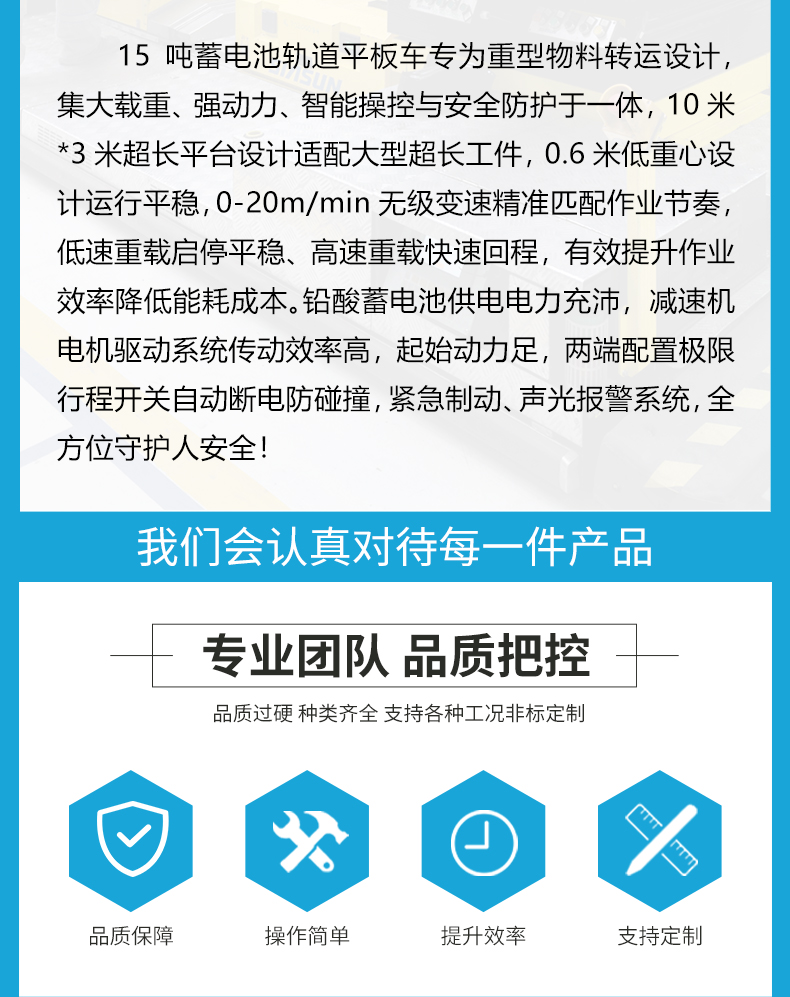 描   述: 15噸蓄電池軌道平板車專為重型物料轉(zhuǎn)運設計,集大載重、強動力、智能操控與安全防護于一體,10米*3米超長平臺設計適配大型超長工件,0.6米低重心設計運行平穩(wěn),0-20m/min無級變速***匹配作業(yè)節(jié)奏,低俗重載啟停平穩(wěn)、高速重載快速回程,有效提升作業(yè)效率降低能耗成本。鉛酸蓄電池供電電力充沛,減速機電機驅(qū)動系統(tǒng)傳動效率高,起始動力足,兩端配置極限行程開關自動斷電防碰撞,緊急制動、聲光報警系統(tǒng)!