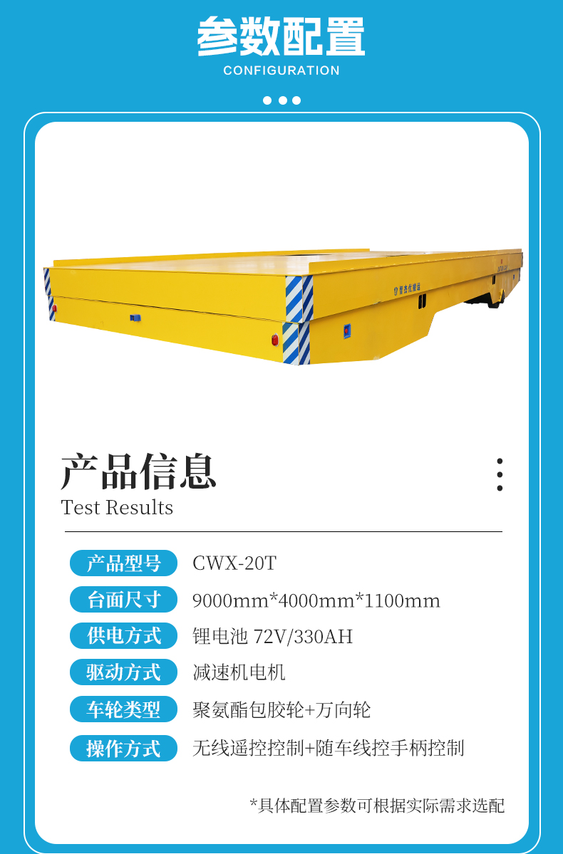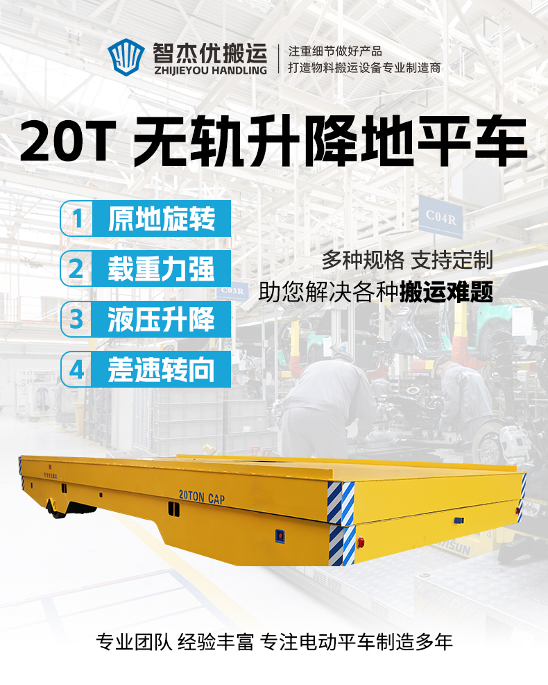描   述: 20噸升降無軌平板轉(zhuǎn)運車,9米超長臺面*4米寬體承載平臺可適配大型設(shè)備及零部件的跨車間轉(zhuǎn)運,臺面定制整體液壓升降,升降行程300mm整體頂升后車身高度可達1.4米,輕松應(yīng)對高低落差裝卸場景,輪系配備聚氨酯包膠車輪+萬向輪適應(yīng)多種地面運行,差速轉(zhuǎn)向靈活自由,可進行原地旋轉(zhuǎn)作業(yè),車間、倉庫、港口全域暢行!